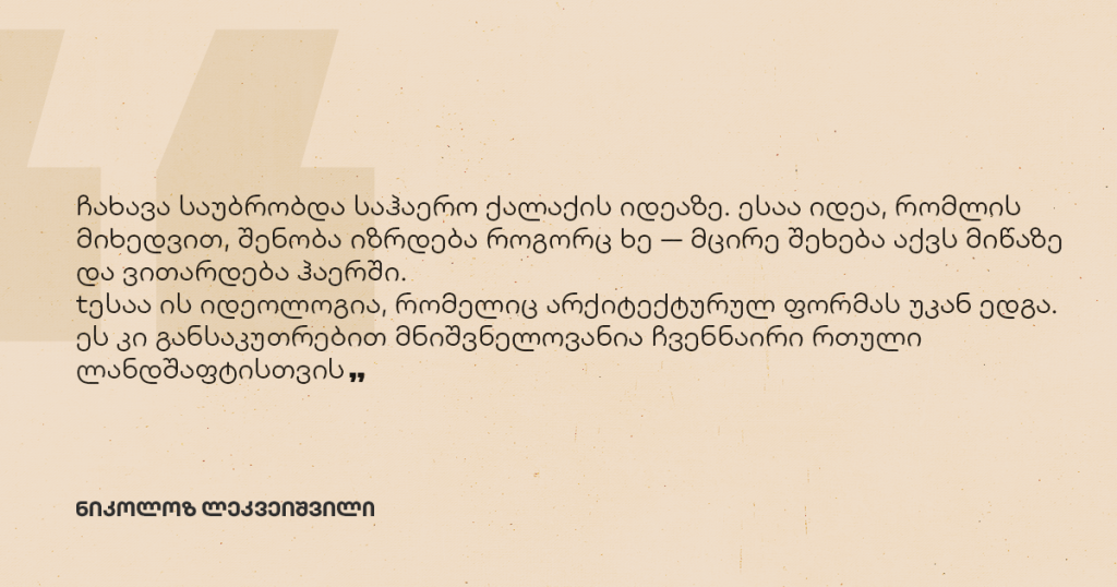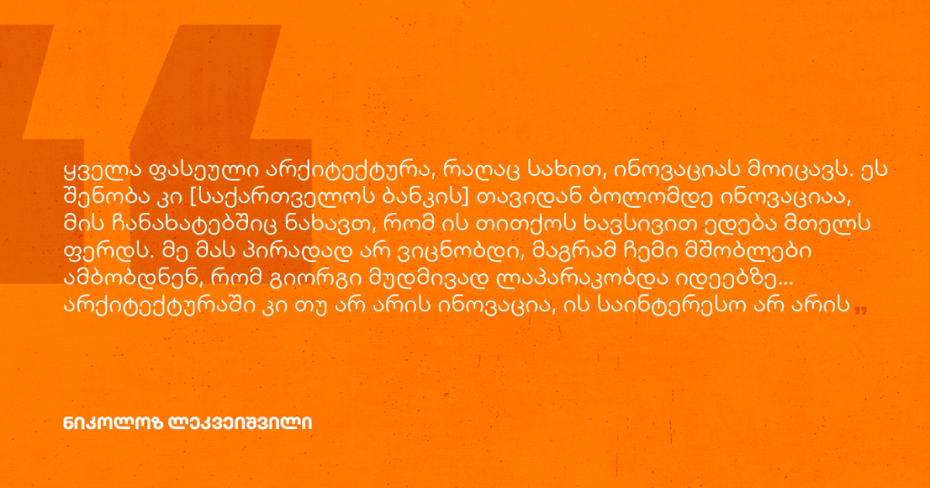 “60-იან წლებში იაპონიაში დაიწყო მოძრაობა, იაპონური მეტაბოლიზმი. ეს იყო ერთგვარი იდეოლოგია, რომელიც მეტწილად ქაღალდის არქიტექტურაში გამოიხატებოდა და მსოფლიოში სულ რამდენჯერმე გამოვლინდა რეალობაში. მათ შორისაა საქართველოს ბანკის შენობა და იგი ნამდვილად იაპონური მეტაბოლიზმის ფიზიკური მანიფესტაციაა”, — ამბობს ნიკოლოზ ლეკვეიშვილი და იხსენებს გიორგი ჩახავას “საჰაერო ქალაქის” იდეას, რომელიც სწორედ ამ იდეოლოგიის ნაწილად შეიძლება განვიხილოთ.