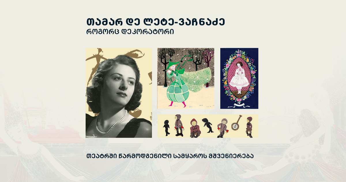 თამარ დე ლეტე-ვაჩნაძე იყო მხატვარი, კოსტიუმებისა და დეკორაციების დიზაინერი, წიგნების ილუსტრატორი და კრისტიან დიორისთვის შექმნილი ესკიზების ავტორიც კი. მის ცხოვრებასა და საქმიანობაზე მოკლედ უკვე მოგიყევით სხვა ბლოგში. თუმცა, ხელოვანმა თავისი ცხოვრების მნიშვნელოვანი ნაწილი თეატრს მიუძღვნა და წინამდებარე ტექსტშიც ამაზე ვისაუბრებთ.