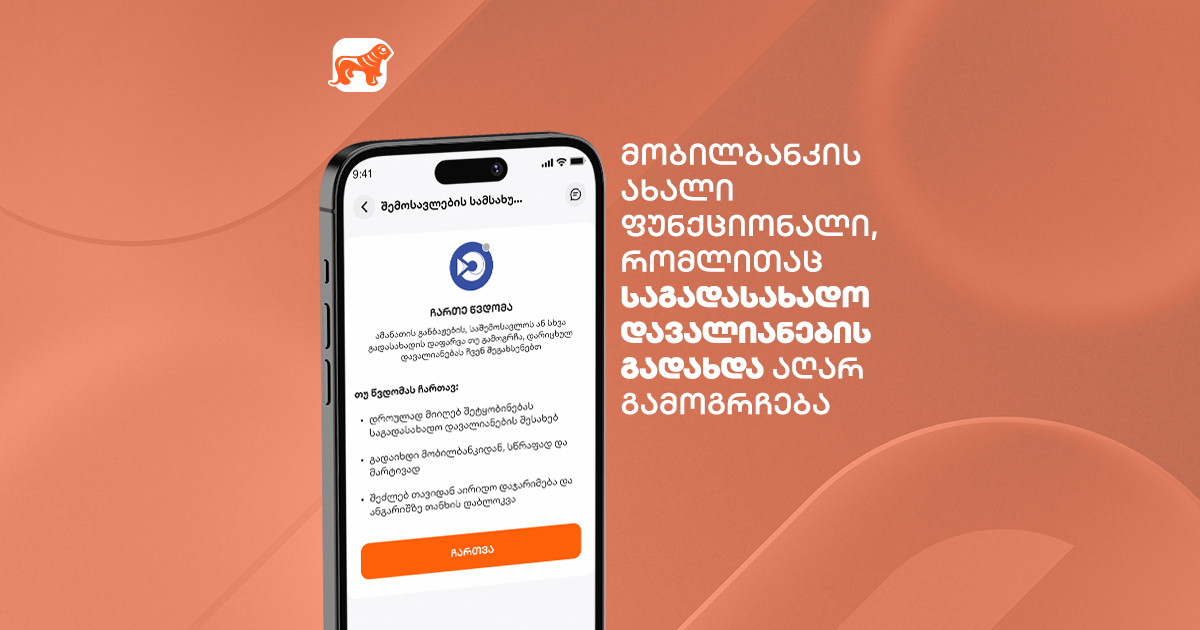 იმისათვის, რომ ისარგებლო მობილბანკის ახალი ფუნქციონალით, საჭიროა, აპლიკაციაში დაეთანხმო შემოსავლების სამსახურთან თანამშრომლობის ფარგლებში ინფორმაციის გადაცემის, მიღებისა და დამუშავების პუნქტს, რის შემდეგაც ბანკი ავტომატურად გადაამოწმებს დავალიანებას და ამას ყოველდღიურად გაცნობებს.
