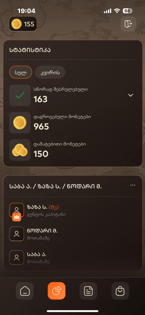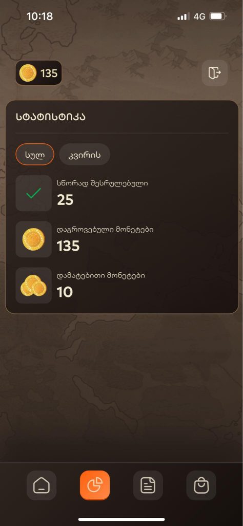 როგორ უნდა გაიგო, რამდენი დამატებითი მონეტა გაქვს მოგროვებული? უკვე იმდენი ხანია, თამაში დაიწყო, სულ ადვილად შეიძლებოდა სათვალავი აგრეოდა… ამიტომ, როცა მობილბანკის აპში თამაშს გახსნი, ქვედა ველში აირჩიე მარცხნიდან მეორე განყოფილება — „სტატისტიკა“. აქ შეგიძლია ნახო როგორც კვირის განმავლობაში, ასევე თამაშის დაწყებიდან დღემდე მოგროვებული სწორი პასუხების, მონეტებისა და დამატებითი მონეტების ჯამი. აი, სწორედ თამაშის დაწყებიდან დღემდე („სულ“) უნდა გქონდეს იმდენი დამატებითი მონეტა, რამდენიც ზემოთ ვახსენეთ.